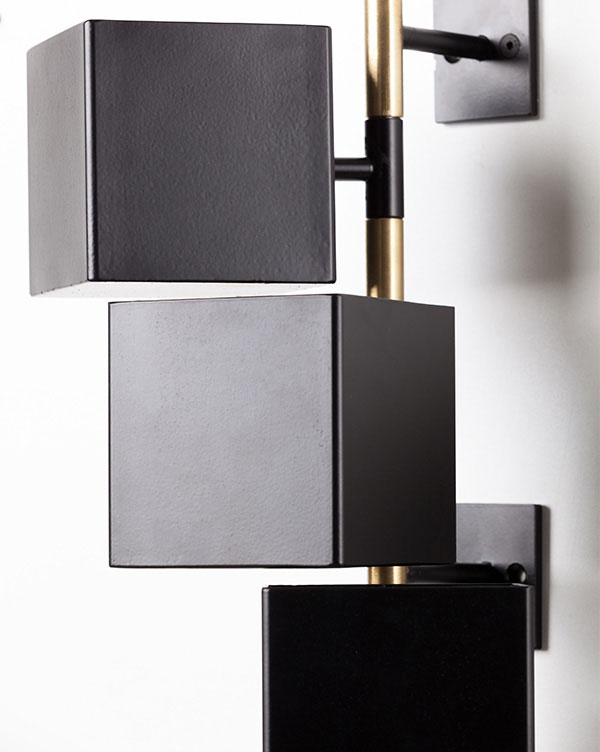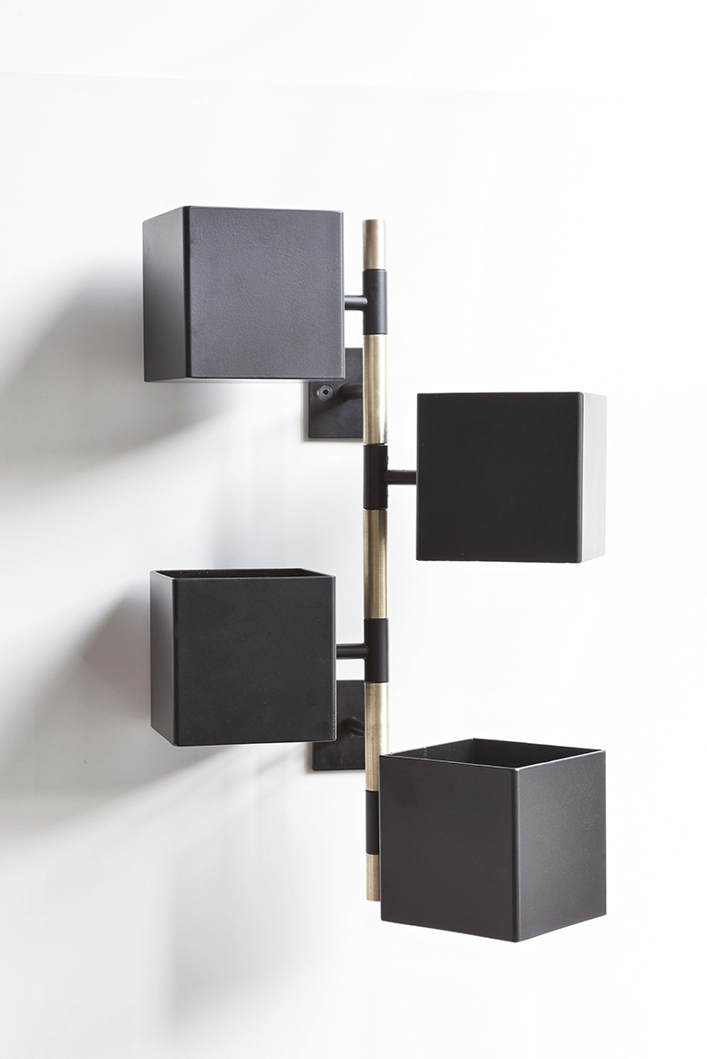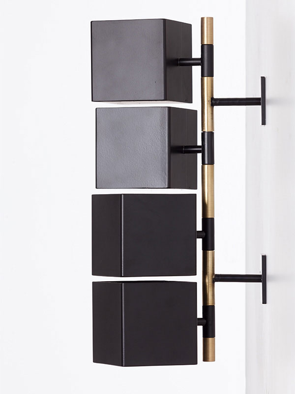 Pochette, is a wall-mounted empty container designed to avoid wasting time “looking for the lost object” (keys, cell phone, glasses, etc.), managing to direct, with its sculptural presence, spontaneous gestures and daily habits. Composed by revolving boxes around a vertical axis to be fixed to the wall to gather and protect all of your small personal belongings. Handcrafted in brass or varnished iron sheets. It has a contemporary, yet evergreen look.